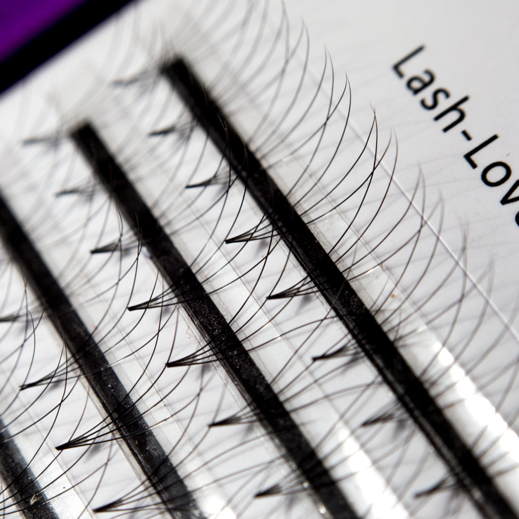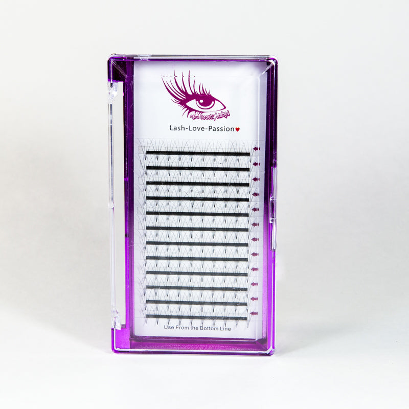 Machine-made pre-fan 4D is made of 100% Korean premium synthetic lash fiber. The thickness is 0.07mm which is very lightweight compare to natural lashes thickness 0.18. Hence, it is very gentle to clients' natural lashes. This is the short leg fan, together with the dark black color make the fan look fuller on clients' lashes.